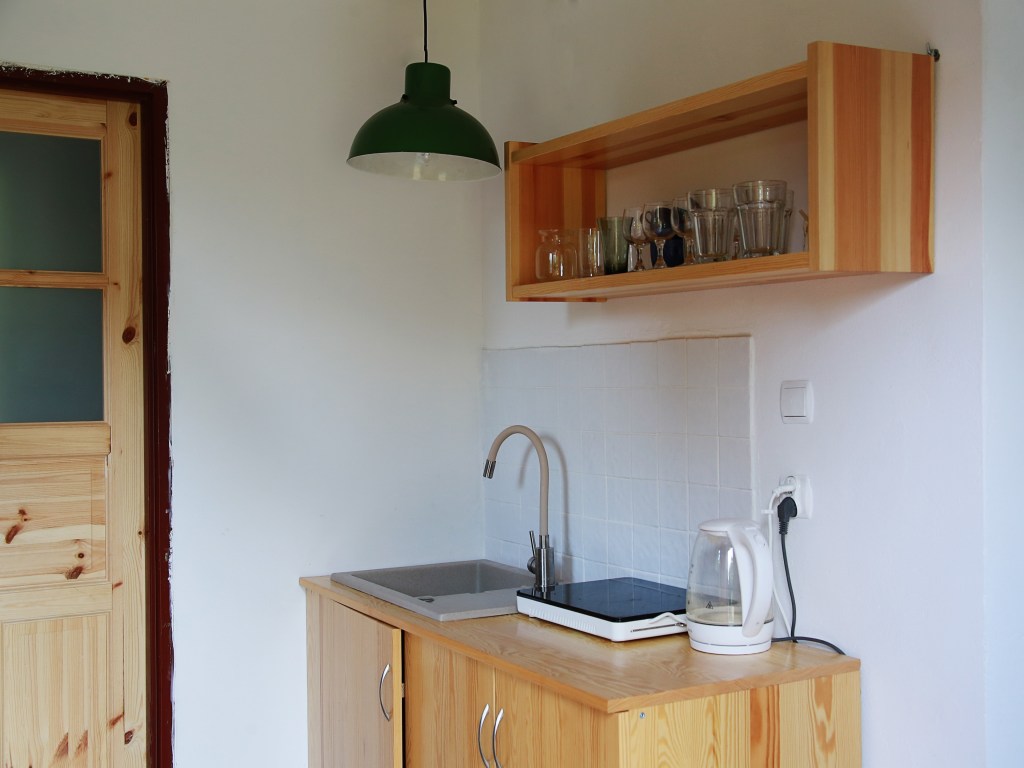 Nasz domek składa się z dwóch pomieszczeń w których komfortowo wyśpią się cztery osoby. Nie zapominaj jednak, że zawsze większa grupa może rozbić namiot.